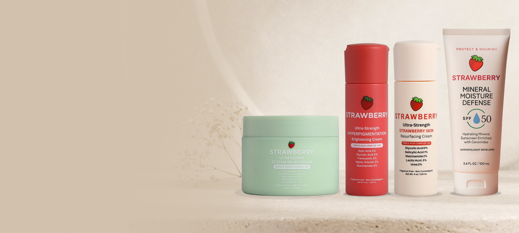 Strawberry formulas use dermatology trusted ingredients designed to smooth texture, support the skin barrier, and remain gentle for sensitive skin.