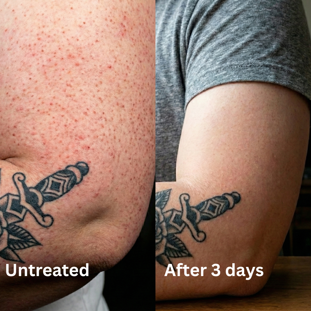 Glycolic Acid (6%) - The smallest AHA molecule, glycolic acid penetrates deeply to dissolve the intercellular "glue" holding excess keratin cells together. Research in the Journal of Dermatological Treatment demonstrated that 10% glycolic acid reduced KP by 62% over 8 weeks.